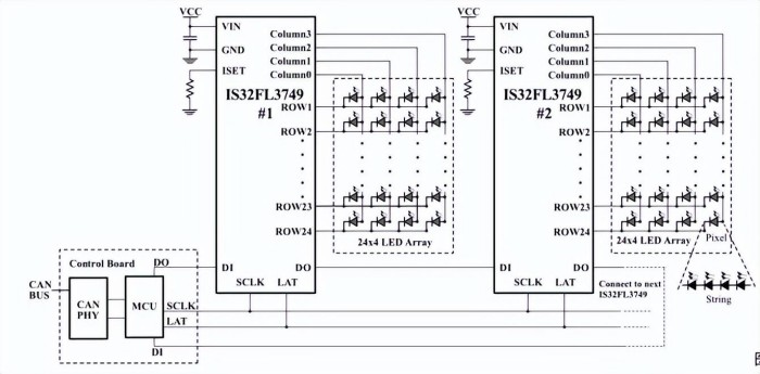 Lumissil在高亮度、矩陣和動畫類別中為汽車LED照明提供許多具有成本效益的獨特解決方案。用于汽車動畫的新型LED驅(qū)動器之一是IS32FL3749.它是一個矩陣LED驅(qū)動器,具有快速33MHz串行移位菊花鏈總線,可以互連多個IS32FL3749器件。每個驅(qū)動器有24個高壓(16V)恒流通道。這種高電壓能力便于用一串正向電壓最高可達(dá)16V的led來代替每個像素(圖4)。通過使用一個電阻,所有行通道都可以配置為吸收高達(dá)60mA的電流。該驅(qū)動器還包括四個列控制,允許它驅(qū)動24(行)× 4(列)LED陣列,陣列大小為96個LED。陣列中的每個LED還可以映射為紅色、綠色或藍(lán)色組,以實現(xiàn)RGB組控制,從而減少數(shù)據(jù)編程流量。