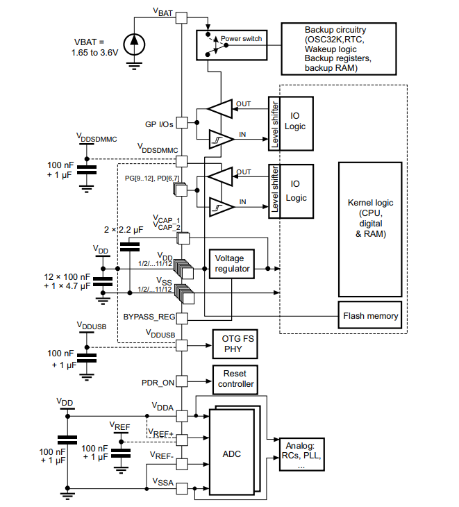 STM32F722VCT6微控制器的工作溫度范圍為–40至+85°C,電源電壓為1.7至3.6 V。USB(OTG_FS和OTG_HS)和SDMMC2(時鐘、命令和4位數(shù)據(jù))的專用電源輸入可用,以提供更大的電源選擇。