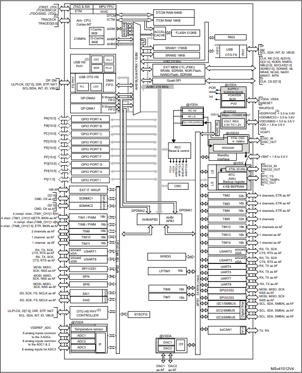 高級外圍設備包括兩個SDMMC接口和一個靈活的內(nèi)存控制(FMC)