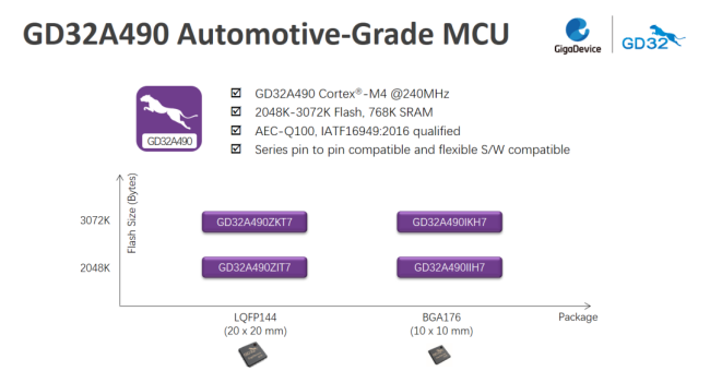 ▲GD32A490系列Cortex?-M4內(nèi)核車規(guī)級MCU GD32A490系列車規(guī)級MCU采用Arm? Cortex?-M4內(nèi)核,運行主頻高達240MHz,配備了高達3072KB片上Flash,以及768KB SRAM。支持代碼執(zhí)行零等待,性能可達355 DMIPS。還集成了豐富外設(shè)資源,提供多達4個USART和4個UART,3個I2C,6個SPI,2個I2S,其中USART支持與LIN通信互傳。 為滿足車載網(wǎng)關(guān)的應(yīng)用所需,還支持2個CAN2.0B、100M以太網(wǎng)及USB2.0 FS/HS通信。片上集成了TFT LCD控制器及各種多媒體接口,適合車載中控、娛樂影音、儀表盤等多元化場景。 GD32A490配備了3個采樣速率高達2.6M SPS的12位高速ADC和2個12位DAC以支持車用電機控制,多達140個GPIO可以實現(xiàn)BCM模塊多負載控制。該系列MCU提供了BGA176和LQFP144兩種封裝、四個型號選擇,目前已經(jīng)正式量產(chǎn)供貨。 ▲GD32A490系列車規(guī)MCU產(chǎn)品組合 GD32A490的推出進一步擴大了GD32A系列車規(guī)MCU的產(chǎn)品陣容。得益于GD32家族豐富完善的生態(tài)系統(tǒng),用戶沿用已有的GD32調(diào)試量產(chǎn)工具、技術(shù)文檔、軟硬件平臺即可開發(fā)車規(guī)級項目,配套的GD32A490I-EVAL全功能評估板以及GD32A490Z-START入門級學(xué)習(xí)套件同步上市。 兆易創(chuàng)新的產(chǎn)品開發(fā)和管理體系已通過ISO 26262:2018汽車功能安全最高等級ASIL D流程認證,持續(xù)以高品質(zhì)和高安全性的車規(guī)產(chǎn)品與服務(wù),提升國產(chǎn)汽車在全球的競爭力。關(guān)于GD32 MCU 兆易創(chuàng)新GD32 MCU是中國高性能通用微控制器領(lǐng)域的領(lǐng)跑者,中國最大的Arm? MCU家族,中國第一個推出的Arm? Cortex?-M3、Cortex?-M4、Cortex?-M23、Cortex?-M33及Cortex?-M7內(nèi)核通用MCU產(chǎn)品系列,并在全球首家推出RISC-V內(nèi)核通用32位MCU產(chǎn)品系列,已經(jīng)發(fā)展成為32位通用MCU市場的核心之選。以累計超過15億顆的出貨數(shù)量,超過2萬家客戶數(shù)量,45個系列550余款產(chǎn)品選擇所提供的廣闊應(yīng)用覆蓋率穩(wěn)居中國本土首位。 兆易創(chuàng)新GD32 MCU也是Arm?大學(xué)計劃(University Program, AUP)中國首批合作伙伴、Arm? mbed? IoT平臺生態(tài)合作伙伴、RISC-V基金會戰(zhàn)略會員、“兆易創(chuàng)新杯”中國研究生電子設(shè)計競賽的冠名廠商。GD32以打造“MCU百貨商店”規(guī)劃發(fā)展藍圖,為用戶提供最全面的系統(tǒng)級產(chǎn)品和解決方案支撐,構(gòu)建智能化開發(fā)平臺和完善的產(chǎn)品應(yīng)用生態(tài)。更多信息歡迎訪問GD32MCU.com。 關(guān)于兆易創(chuàng)新 兆易創(chuàng)新科技集團股份有限公司(股票代碼603986)是全球領(lǐng)先的Fabless芯片供應(yīng)商,公司成立于2005年4月,總部設(shè)于中國北京,在全球多個國家和地區(qū)設(shè)有分支機構(gòu),營銷網(wǎng)絡(luò)遍布全球,提供優(yōu)質(zhì)便捷的本地化支持服務(wù)。兆易創(chuàng)新致力于構(gòu)建以存儲器、微控制器、傳感器、模擬產(chǎn)品為核心驅(qū)動力的完整生態(tài),為工業(yè)、汽車、計算、消費電子、物聯(lián)網(wǎng)、移動應(yīng)用以及通信領(lǐng)域的客戶提供完善的產(chǎn)品技術(shù)和服務(wù),已通過ISO26262:2018汽車功能安全最高等級ASIL D體系認證,并獲得ISO 9001、ISO 14001、ISO 45001等體系認證和鄧白氏認證,與多家世界知名晶圓廠、封裝測試廠建立戰(zhàn)略合作伙伴關(guān)系,共同推進半導(dǎo)體領(lǐng)域的技術(shù)創(chuàng)新。