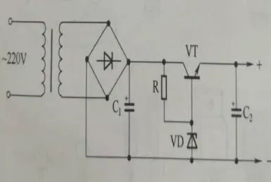 (2) 串聯穩壓電路。如圖2-60所示,由于串聯在輸出電路中的調整管VT的基極電壓被穩壓二極管VD所穩定,所以當輸出電壓發生變化時,調整管VT的基-射極間電壓相應變化,使得VT的管壓降向相反方向變化,從而使輸出電壓基本保持穩定。