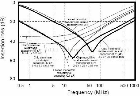 參見上圖,我們想要的最好的濾波效果是在“谷”底,就是曲線凹進去的尖尖,在這個尖尖的時候,濾波效果做好,當我們的芯片IC內部的邏輯門在10-50Mhz范圍內執行的時候,芯片內部產生的干擾也在10-50Mhz,(比如51單片機),仔細看上圖的曲線,0.1uF電容 (有兩種,一種是插件,一種是貼片)的谷底剛好落在了這個范圍內,所以能夠濾除這個頻段的干擾,但是,當頻率很高的時候(50-100Mhz),就不是那么回事了,這個時候0.1uF電容個濾波效果就沒有0.01uF好了,以此類推,頻率再高,選用的濾波電容的量級還要變小,參考如下