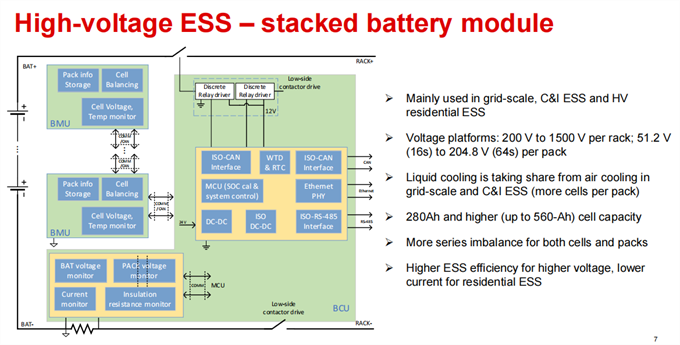 對于高壓ESS系統而言,要采用分立方案,需要包括BMU和CMU兩部分,每個Rack為200V-1500V,每個Pack為51.2V至204.8V,電芯數量由16個至64個不等。其中BMU負責每個pack的均衡、電壓監控和溫度監控,BCU負責測量電流、電壓監控、SoC計算、通信等等。