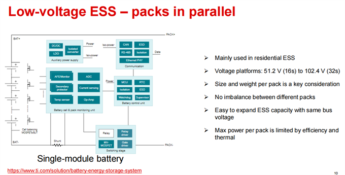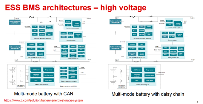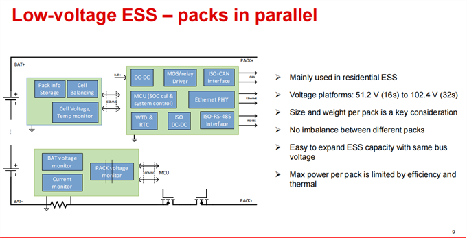 對于住宅儲能系統而言,電壓要低得多,一般都是48V或者并聯100V系統,因此BMU和CMU可以集成,因此系統要負責包括電壓、電流以及溫度監控。