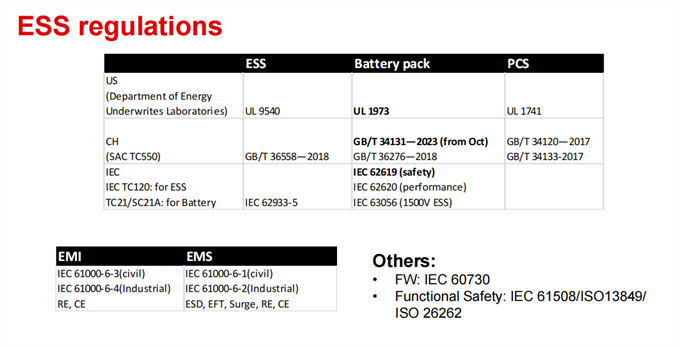 對于任何儲能系統而言,安全都是至關重要的,各地區針對ESS、電池包以及PCS出臺了相應的法律法規,另外包括EMC也有嚴格的限制。而隨著安全可靠性的要求不斷提升,功能安全也正在有更多的監管出臺。