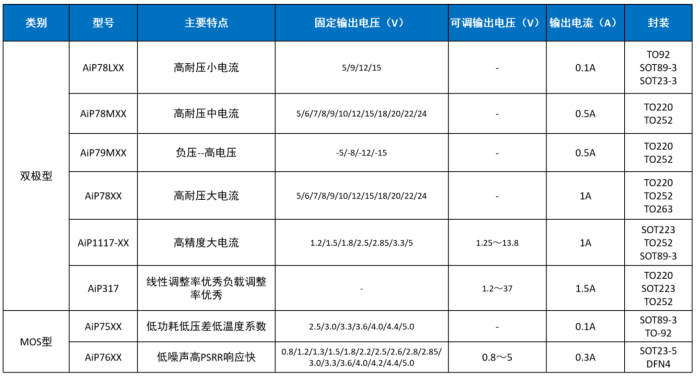 LDO指的是低壓差線性穩(wěn)壓器,是一種輸入電壓大于輸出電壓的直流交流穩(wěn)壓器,可以分為雙極型和MOS型。雙極型LDO可以承受高輸入電壓,靜態(tài)電流為mA級別,MOS型LDO噪聲更小,靜態(tài)電流相比于雙極型也更低,一般在uA級別。 中微愛芯已開發(fā)的雙極型LDO有78XX系列、79XX系列、AiP1117系列、AiP71XX系列等,MOS型LDO有AiP75XX系列和AiP76XX系列,涵蓋正電源穩(wěn)壓器、負(fù)電源穩(wěn)壓器,低壓差正電源穩(wěn)壓器、輸出電壓調(diào)整電路、低壓差穩(wěn)壓器、可調(diào)精密并聯(lián)穩(wěn)壓器等多種類型。以AiP1117-ADJ為例,這是一款最大輸出電流為1A的低壓差穩(wěn)壓器,內(nèi)置溫度保護,外接電阻即可實現(xiàn)輸出電壓可調(diào),可廣泛應(yīng)用于各種需要高精度,低壓降正向穩(wěn)壓場合。