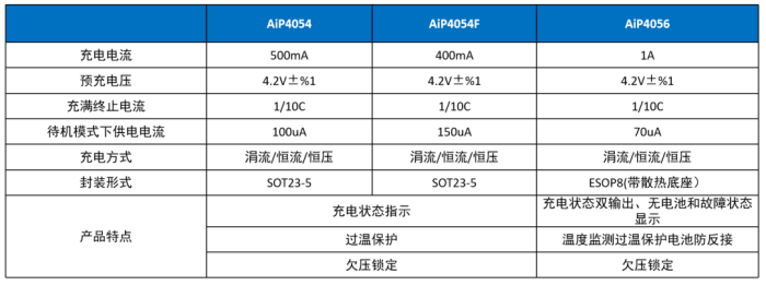 中微愛芯電池管理產(chǎn)品線涵蓋鋰電池和鋰磷酸鹽電池管理監(jiān)控器、線性鋰電池充電芯片,其中線性鋰電池充電芯片的有多種充電電流可選。以AiP4054為例,這是一款專門為單節(jié)鋰電池設(shè)計的線性充電芯片,內(nèi)置完善的保護電路(電流監(jiān)控、欠壓鎖定、自動再充電、過溫保護、狀態(tài)指示功能),充電電流可編程,安全性較高。此外,AiP4054采用體積較小的SOT23-5封裝,外圍電路簡單,非常適用于物流箱藍牙鎖、TWS耳機充電倉、電子煙等低功耗、小體積、快速充電的場合。 常見的電池管理芯片有AiP4056、AiP4054系列等。