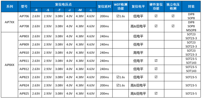 中微愛芯提供帶看門狗功能處理器復(fù)位電路、微處理器復(fù)位電路、電壓檢測電路等多種電源監(jiān)控芯片,擁有齊全的復(fù)位電壓點。以AiP706為例,這是一款帶看門狗功能的微處理器監(jiān)控電路芯片,內(nèi)置復(fù)位電路和看門狗定時器(1.6秒超時)。AiP706微處理器監(jiān)控電路降低了監(jiān)控系統(tǒng)中電源和電池功能所需的復(fù)雜性和組件數(shù)量,非常適用于光伏發(fā)電系統(tǒng)。 常見的復(fù)位芯片有AiP38XX系列,AiP7XX系列和AiP8XX系列,我司設(shè)計多種封裝可供選擇,應(yīng)用場景廣泛