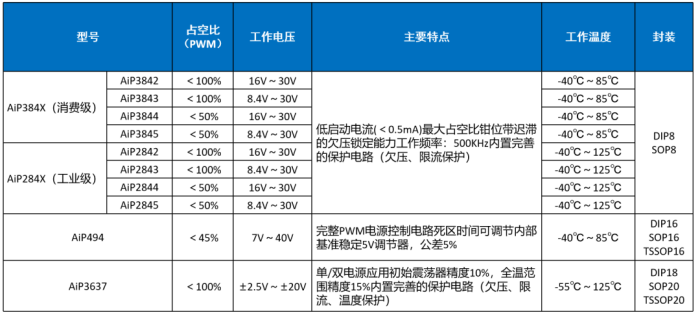 脈寬調(diào)制(PWM)是指脈沖寬度調(diào)制,也可稱之為定頻調(diào)寬,即開關(guān)頻率保持恒定,而通過改變在每一個周期內(nèi)的驅(qū)動信號的占空比來達到調(diào)制的目的。當(dāng)輸出電壓發(fā)生變化時,通過環(huán)路的控制,便會使驅(qū)動信號的占空比發(fā)生改變,從而維持輸出電壓的恒定。 中微愛芯可提供輸出占空比<100%或<50%的電流模式PWM控制器、直流馬達驅(qū)動的PWM控制器。以AiP494為例,這是一款固定頻率脈沖寬度調(diào)制電路,集成PWM控制電路所需的幾乎全部模塊,外圍電路簡單。提供共發(fā)射極/共集電極輸出,可用于驅(qū)動橋式或推挽電路開關(guān)管。常見的電源PWM控制器有AiP384X系列、AiP284X系列等,廣泛應(yīng)用于工業(yè)控制、消費電子等場合。