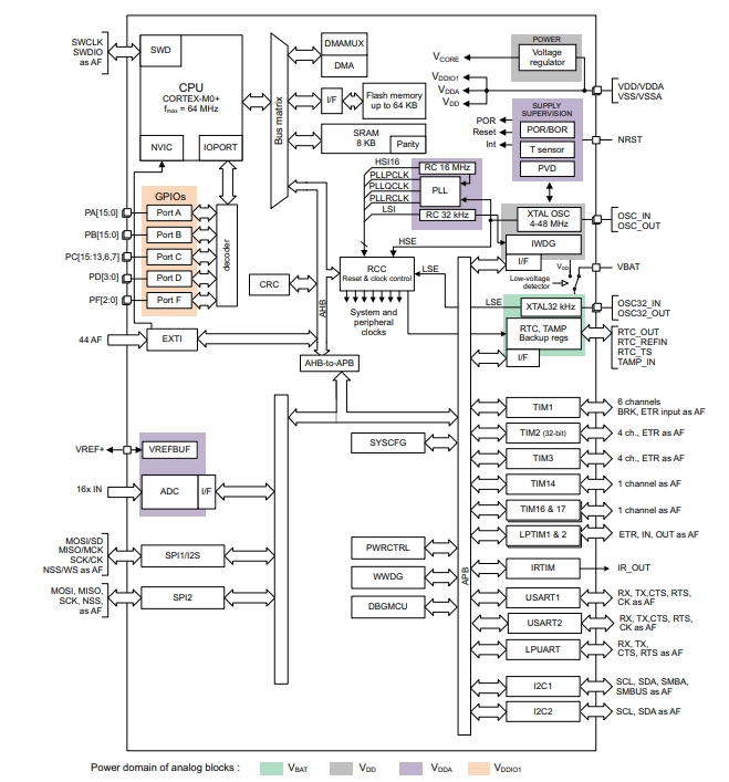 STM32G031F8P6包括存儲器保護單元(MPU)、高速嵌入式存儲器(8 KB SRAM和高達64 KB閃存程序存儲器,具有讀保護、寫保護、專有代碼保護和安全區(qū)域)、DMA、廣泛的系統(tǒng)功能、增強的I/O和外圍設備。