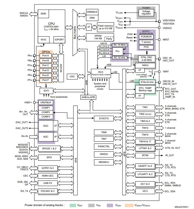 STM32G0B1RCT6包括存儲器保護單元(MPU)、高速嵌入式存儲器(144KB SRAM和512 KB閃存程序存儲器,具有讀保護、寫保護、專有代碼保護和安全區域)、DMA、廣泛的系統功能、增強的I/O和外圍設備。