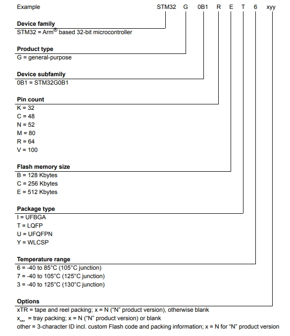 意法半導(dǎo)體STM32G0B1VET6的型號解釋圖