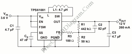 TPS61080 集成電源開關的電流限制額定值為 0.5A,TPS61081 為 1.3A。這是電路圖: