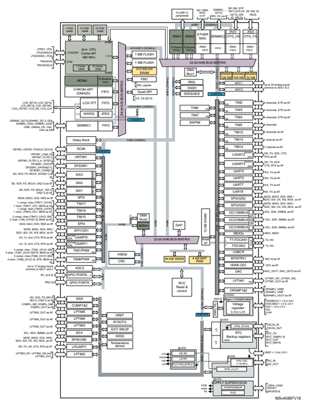 STM32H753xI設(shè)備包含高速嵌入式存儲(chǔ)器,具有2兆字節(jié)的雙組閃存、高達(dá)1兆字節(jié)的RAM(包括192兆字節(jié)的TCM RAM、高達(dá)864兆字節(jié)的用戶SRAM和4兆字節(jié)的備份SRAM),以及連接到APB總線、AHB總線、,2x32位多AHB總線矩陣和支持內(nèi)部和外部存儲(chǔ)器訪問(wèn)的多層AXI互連。