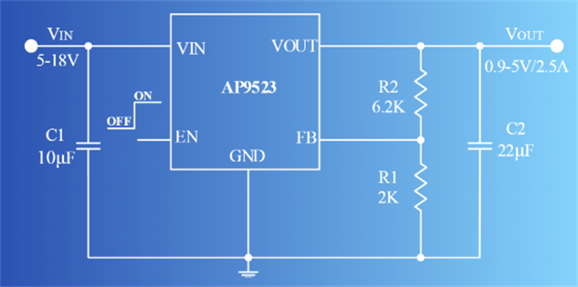 外圍精簡:僅需2顆輸入輸出電容和2顆輸出電壓調(diào)節(jié)電阻;