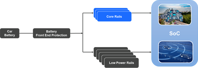 未來汽車的中央計算機將依靠功能強大的 SoC。這些 SoC 將具有先進的 CPU 和 GPU 功能,能夠處理海量的數據并執行復雜的計算,讓車輛能夠實時做出決策。這樣的SoC 需要先進的電源管理解決方案,尤其是核心電壓軌的電源解決方案。
