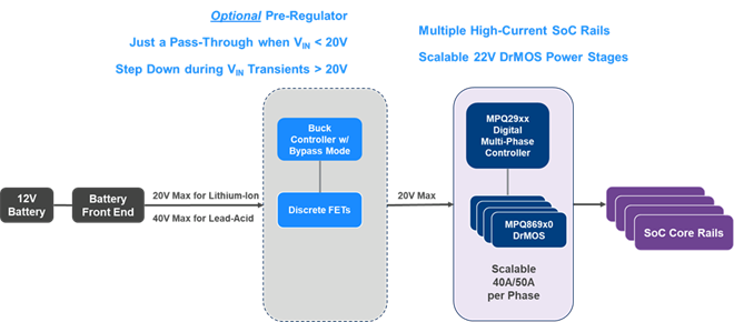 圖 6 展示了一個采用 22V 額定電壓 DrMOS 產品實現的單級功率轉換方案。配備12V鋰離子電池的汽車可以直接使用22V DrMOS,無需預調節器將電池電壓轉換為 SoC 核心軌電壓。這是實現最佳效率、更小PCB 面積、更低成本和更優電氣性能的理想解決方案。
