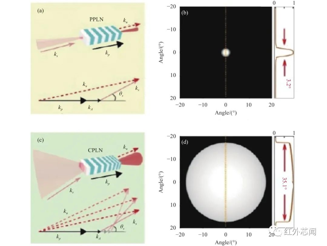 對于結構光場或者圖像的頻譜遷移探測需要使用體塊晶體。空間帶寬主要受限于晶體橫截面的尺寸和相位匹配函數。在晶體尺寸確定的情況下,增加空間帶寬的主要手段是調控相位匹配函數。增加相位匹配函數對于入射角大小的容忍度即可增加空間帶寬,與增加頻率帶寬相似,主要方法也包括溫度梯度法、寬譜泵浦方法、啁啾極化和非共線準相位匹配。主要進展包括:2018年,R. Demur等人通過寬譜泵浦,相對于窄帶單頻泵浦,視場角提升了3倍多,有效像素點增加了10倍;2022年,基于啁啾極化的方式,曾和平教授研究組在中紅外波段實現了約30°的頻譜遷移成像視場角(如圖6所示)。