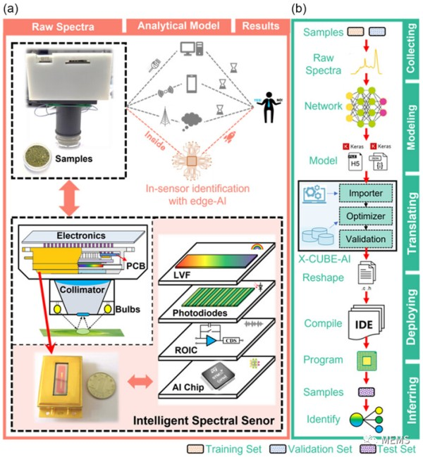 基于近紅外光譜的AI分析模型的片上集成是智能光譜傳感器發(fā)展的關(guān)鍵環(huán)節(jié),具體流程如圖1b所示。