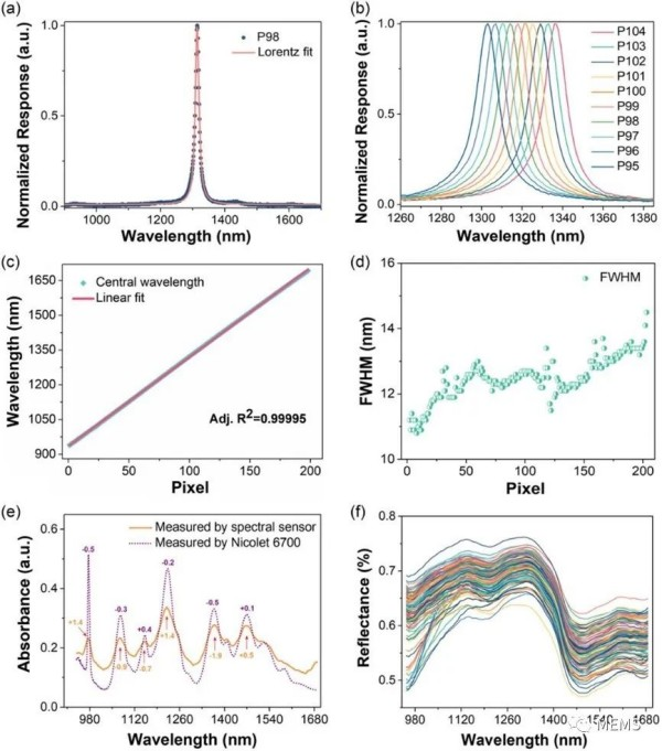 在實(shí)際應(yīng)用之前,研究人員首先分析了該光譜傳感器的實(shí)際光譜性能,相關(guān)結(jié)果如圖2所示。圖2a和圖2b展示了900 nm ~ 1700 nm范圍中部分像素對(duì)單色光的歸一化光譜響應(yīng),具有典型的洛倫茲-高斯分布(Lorentz–Gauss distribution)帶通特征,且截止值小于OD2。圖2d展示了所有可用像素的半峰全寬(FWHM)。該光譜傳感器的基本性能可以與商用InGaAs便攜式光譜儀相媲美。