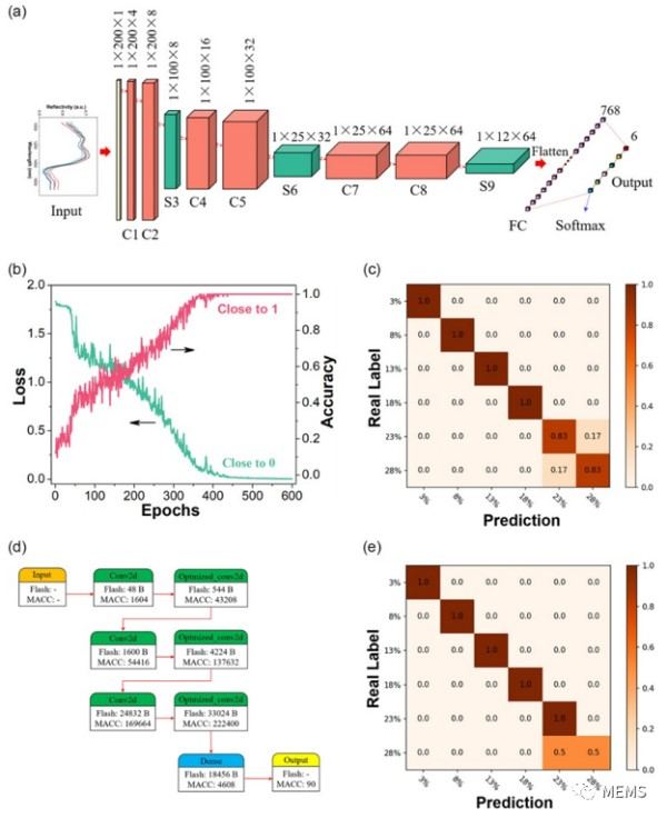 在這項(xiàng)研究中,研究人員還想要證明部署于邊緣(集成在傳感器中)的深度學(xué)習(xí)光譜分析模型可以達(dá)到與部署于計(jì)算機(jī)的傳統(tǒng)算法相同的效果。首先,建立基于卷積神經(jīng)網(wǎng)絡(luò)(CNN)的綠茶摻糖識(shí)別模型,并在計(jì)算機(jī)上進(jìn)行了驗(yàn)證。隨后,將驗(yàn)證后的模型進(jìn)一步部署到集成于InGaAs光譜傳感器的芯片處理器上,用于綠茶摻糖的邊緣識(shí)別。相關(guān)結(jié)果如圖3所示。
