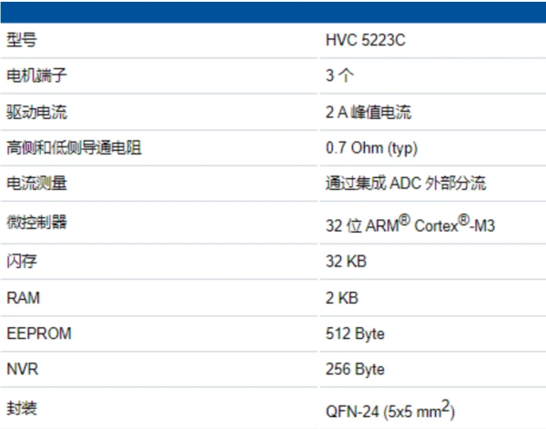 TDK 株式會社 正在擴大其 Micronas 嵌入式電機控制器系列 HVC,并推出 HVC 5223C。這是一款經認證 的汽車級一級產品,全集成電機控制器,可驅動峰值相電流為 2 A 的小型有刷(BDC)或無刷(BLDC)電機。HVC 5223C 采用緊湊型 5x5 平方毫米 24 針 QFN 封裝,在功能上與 HVC 5222C 引腳兼容,HVC 5222C具備 1 A 峰值電流能力。樣品現可供客戶評估。