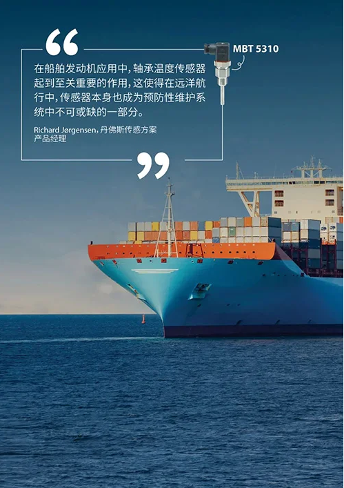 丹佛斯傳感方案產(chǎn)品經(jīng)理Richard J?rgensen表示:“在船舶發(fā)動機應用中,軸承溫度傳感器起到至關重要的作用,這使得在遠洋航行中,傳感器本身也成為預防性維護系統(tǒng)中不可或缺的一部分。” 當考慮為船舶應用選擇軸承溫度傳感器時,防護等級、軸承和傳感器元件之間的安全接觸、以及可靠的質量,是確保發(fā)動機軸承溫度被連續(xù)、 準確監(jiān)測的關鍵條件。