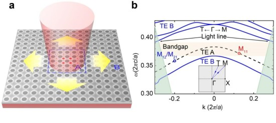 圖1 小型化連續域束縛態(mini-BICs)激光器的原理。(a) Mini-BICs激光器的示意圖;(b) 平板光子晶體的能帶圖:處于光線(Light Line)以上輻射域中有限光子晶體A的能態,位于區域B的帶隙中。