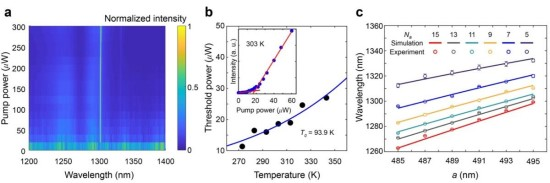 研究組采用微加工工藝制備上述微納結構,采用薄膜轉移技術將其轉移到玻璃襯底上,最后以紫外固化膠作粘結劑在其上方再覆蓋一層玻璃,形成Mini-BIC所需的在垂直方向對稱的平板三明治結構,最終成功制作出最小微腔尺寸約為2.5×2.5 μm2,模式體積約為1.16(λ/n)3的室溫連續光泵浦單模Mini-BIC激光器(圖2a)。該激光器的閾值功率僅17 μW,而且其閾值功率密度只是已報道的具有最佳特性的半導體BIC激光器的1/236。同時,器件最高工作溫度可達343 K (70 ℃),擬合特征溫度高達93.9 K(圖2b)。通過改變光子晶體周期與尺寸,還能夠實現約80 nm范圍的激射波長調諧(圖2c)。