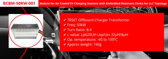 BCBM-50KW-001 50KW帶LLC諧振扼流圈的非車載充電變壓器采用了先進的設計元素,在優化產品性能的同時,還可以解決熱管理的關鍵問題。該產品的關鍵特征是嵌入諧振扼流圈的LLC (LCLC)拓撲,從而實現高效的能量轉移,減少開關損耗。