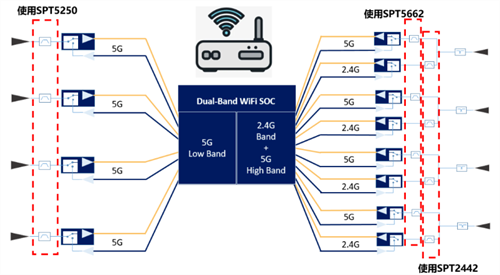 此外,SPT5250和SPT5662系列共存濾波器參考設計將與802.11ax WiFi無線電標準的2 x 2和4 x 4多入多出(MU-MIMO)架構兼容。值得一提的是,對于WiFi 2.4 GHz / WiFi 5.2 GHz / WiFi 5.6 GHz三頻架構的終端設備,2 x 2 MU-MIMO 需要四個5 GHz濾波器,4 x 4則需要八個5 GHz的濾波器。針對高頻段的WiFi應用領域,Spectron未來還將繼續開發并很快推出包括WiFi 6、WiFi 6E、WiFi 7等豐富的產品組合,以及覆蓋3 GHz以上的超大帶寬應用。