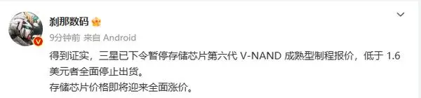 8月18日,有消息人士爆料稱,他們已經(jīng)得到比較確切的消息,三星方面已下令暫停存儲芯片第六代V-NAND成熟型制程報價,低于1.6美元(約11.6元人民幣)者全面停止出貨。這或許意味著存儲芯片市場即將迎來全面漲價。