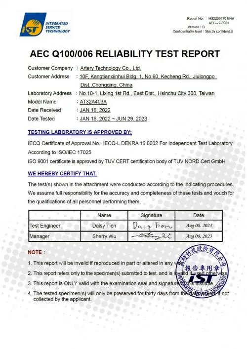 AEC-Q100認(rèn)證是汽車電子委員會(huì)(Automotive Electronics Council)制定的車用電子元件可靠性測(cè)試標(biāo)準(zhǔn),在全球汽車產(chǎn)業(yè)都具有極高的權(quán)威性。AEC-Q100認(rèn)證門檻高,測(cè)試項(xiàng)目覆蓋廣,對(duì)芯片產(chǎn)品的設(shè)計(jì)質(zhì)量、安全性、可靠性要求極為嚴(yán)苛,是集成電路廠家進(jìn)入汽車領(lǐng)域的重要通行證。AT32A403A通過AEC-Q100認(rèn)證,標(biāo)志著雅特力車規(guī)級(jí)MCU性能與可靠性等指標(biāo)符合國(guó)際車規(guī)芯片標(biāo)準(zhǔn),產(chǎn)品質(zhì)量獲得國(guó)際權(quán)威認(rèn)證體系的認(rèn)可和肯定。