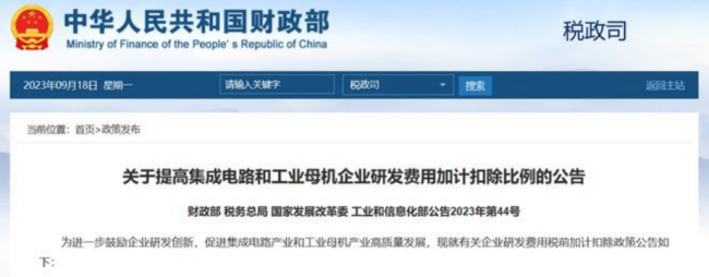 9 月 18 日消息,財(cái)政部、稅務(wù)總局、國家發(fā)展改革委、工業(yè)和信息化部今日聯(lián)合發(fā)布關(guān)于提高集成電路和工業(yè)母機(jī)企業(yè)研發(fā)費(fèi)用加計(jì)扣除比例的公告,進(jìn)一步鼓勵(lì)企業(yè)研發(fā)創(chuàng)新,促進(jìn)集成電路產(chǎn)業(yè)和工業(yè)母機(jī)產(chǎn)業(yè)高質(zhì)量發(fā)展。