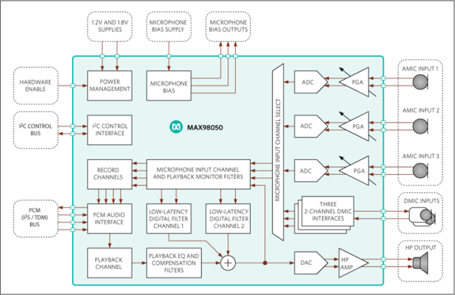 器件包括三路麥克風輸入通道,用于支持語音、環境和抗噪錄音用途。每路通道可單獨通過外部模擬或數字麥克風輸入錄音,然后將音頻數據送到錄音通道(至數字音頻接口)和內部低延遲數字濾波通道。與數字音頻接口的第4個錄音通道允許主機監測回放通道的數字數據輸出。